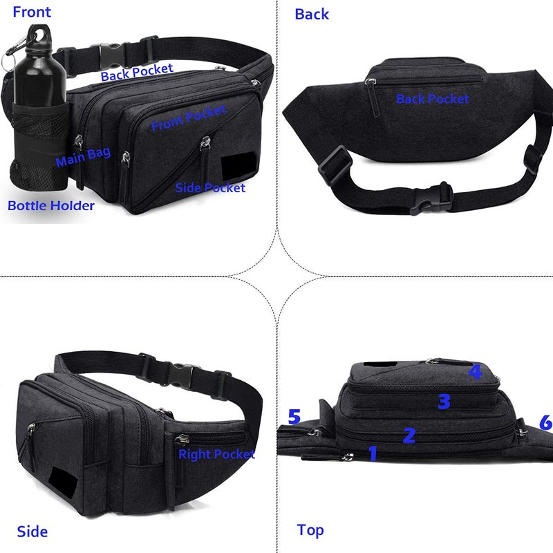 - AMPLE & ENOUGH SPACE CAPACITY - The waist travel bag pouch has 4 different compartments, each of which can be closed with zipper. The narrow compartment at the rear is perfect for mobile phones. Small zipper compartments on both sides of the waist bag pack for storing water bottle bags and small items.The sports waist bag is practical but not bulky when camping & hiking, traveling daily use, and those who need concealed carry.You can wear them in waist, hips, chest, shoulders.