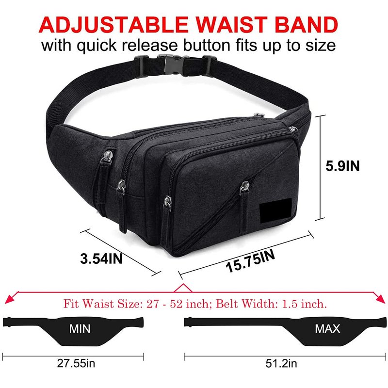 - WAIST BAG SIZE - Main Dimensions: 15.8''L x 5.93'H' x 3.54''W. Six multiple zipper pockets: Front zipper pocket size: 7.15''W x 5.14''H. Medium front pocket Ssize: 7.15''W x 5.14''H. Main zipper pocket size: 15.8''W x 5.54''H. Back zipper pocket size: 8''W x 4.3''H. Two sides zipper pockets size: 4''W x 4''H, the right one have folding water bottle pocket, the left one can stored lighter and coin.The waist bag belt can be adjustable from 25'' to 52''and easily fixed on the waist.
