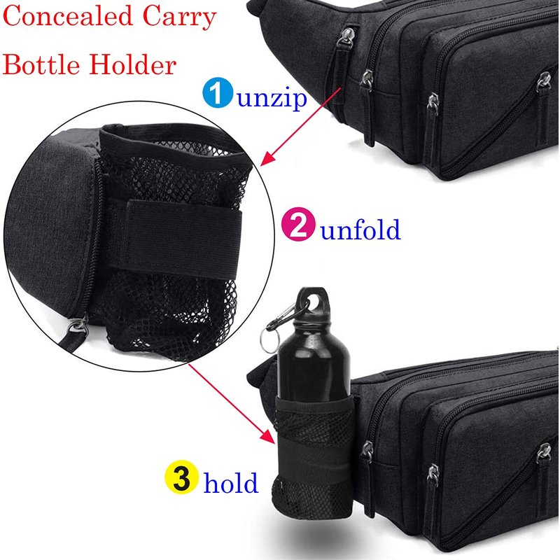 - WATER BOTTLE HOLDER - The bumbags of the pistol waist bag is equipped with a hidden water bottle holder (suitable for water bottles with a diameter of less than 8 cm), and is fixed by a mesh bag and a elastic band. With the help of an adjustable belt, you can easily adjust the hip bum bag that fits your waistline.