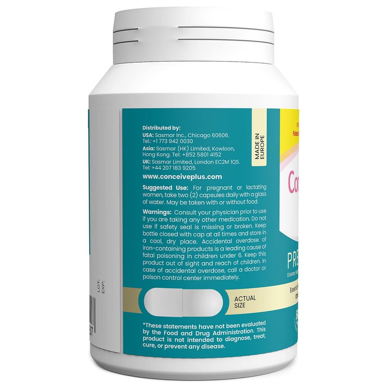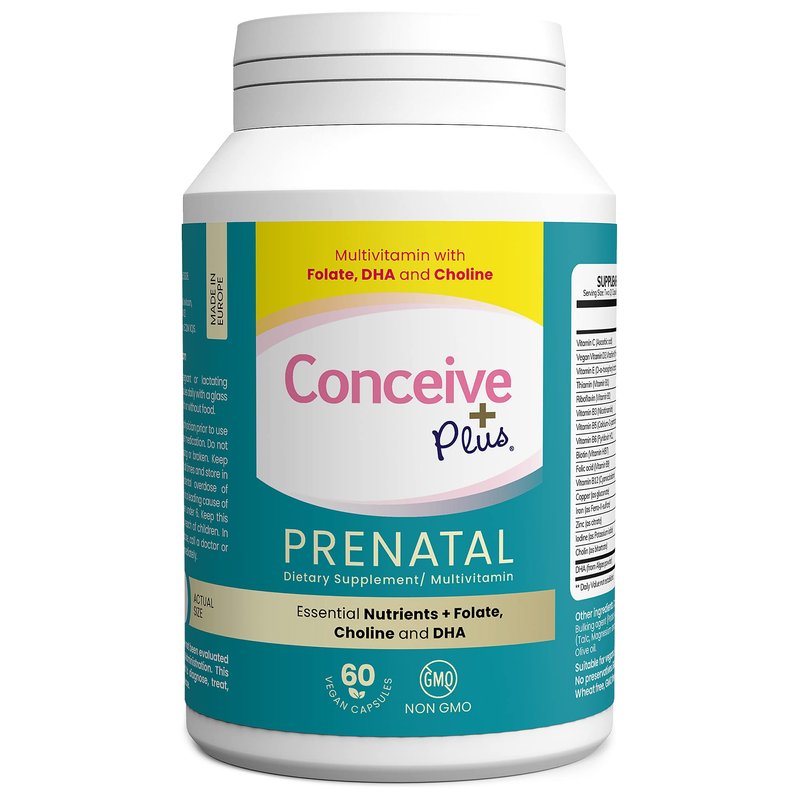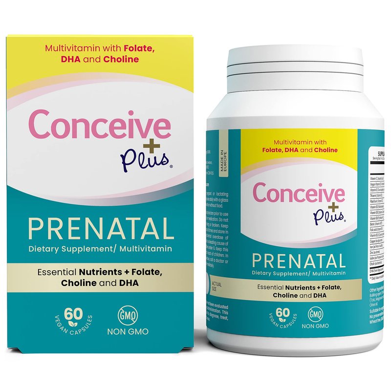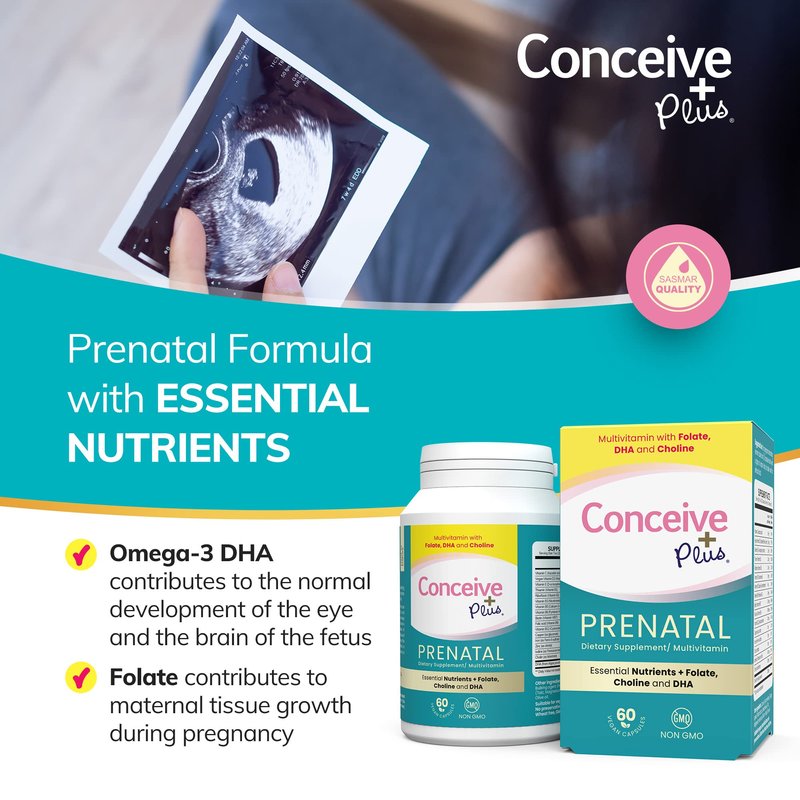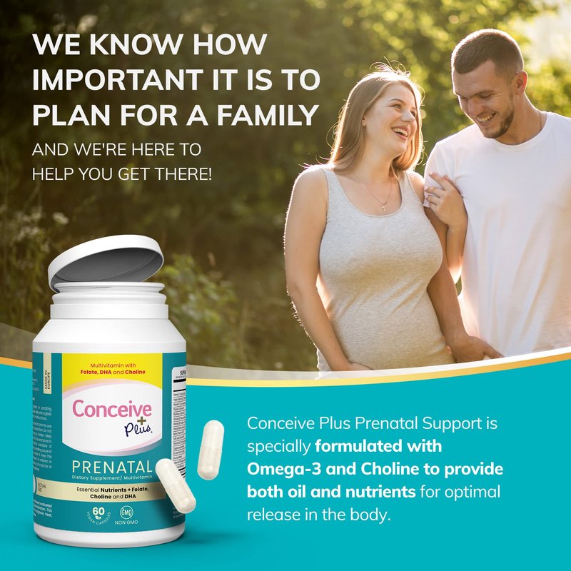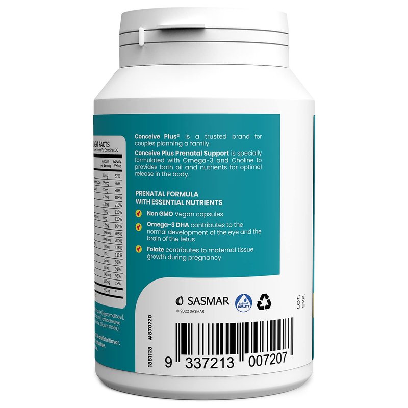 Conceive Plus is a trusted brand for couples planning a family. Conceive Plus Prenatal Support is specially formulated with Omega-3 and Choline to provide both oil and nutrients for optimal release in the body. Prenatal formula with essential nutrients. Non GMO Vegan Capsules Omega-3 DHA contributes to the normal development of the eye and the brain of the fetus. Folate contributes to maternal tissue growth during pregnancy