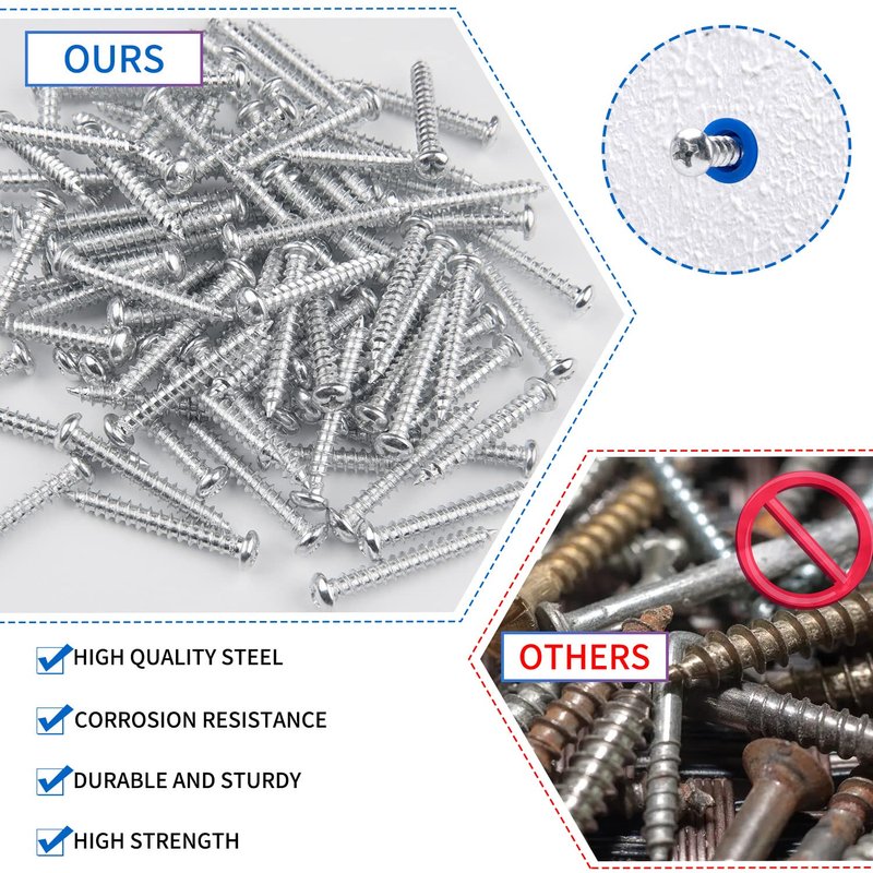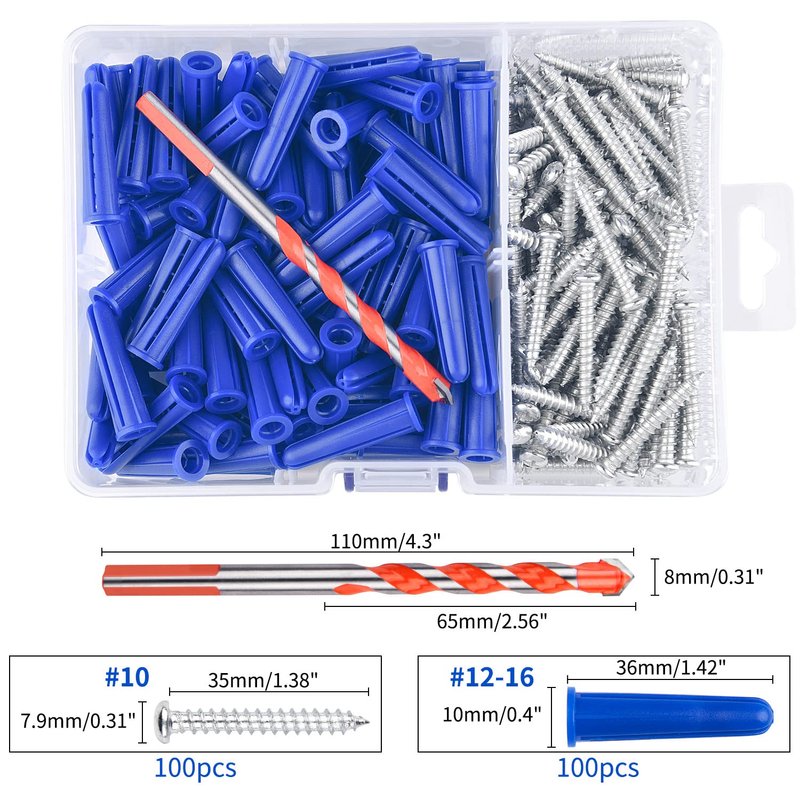 - Package Content: 100pcs screws,100Pcs screw anchors,1 Drill Bit.