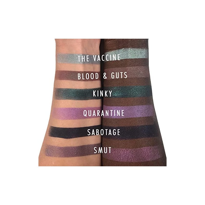 - The Complete Look— 6 complementary eyeshadow shades that can stand alone or be mixed & matched to perfect any look. Includes 1 Kinky (black-base teal w/ rainbow sparkle), 1 The Vaccine (steel blue-grey w/ bright green duochrome), 1 Sabotage (black w/ pink sparkle & sheen), 1 Blood and Guts (rusty red w/ bright aqua shift), 1 Smut (dirty silver w/ pink-purple undertones), and 1 Quarantine (medium pink w/ purple undertones). 2 grams loose mineral eyeshadow powder of EACH color