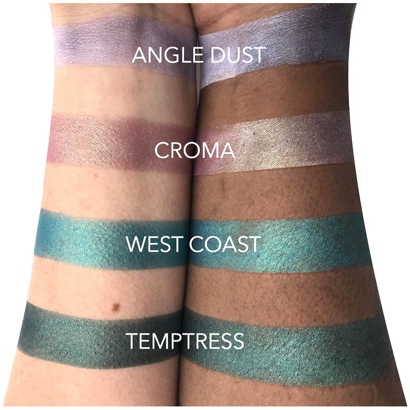 - The Complete Look— 4 complementary eyeshadow shades that can stand alone or be mixed & matched to perfect any look. Includes 1 Temptress (Dark teal with gold sparkle), 1 Croma (Shimmery lavender with aqua sparkle), 1 West Coast (Vibrant ocean blue-green), and 1 Angel Dust (Pink-lavender with bright aquamarine shift). 2 grams loose mineral eyeshadow powder of EACH color