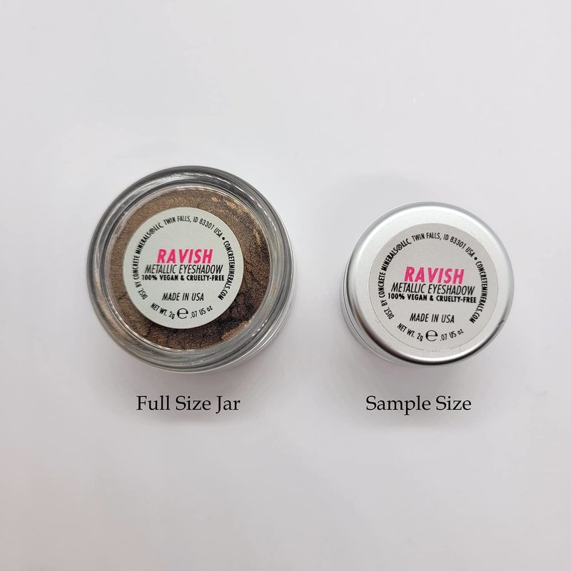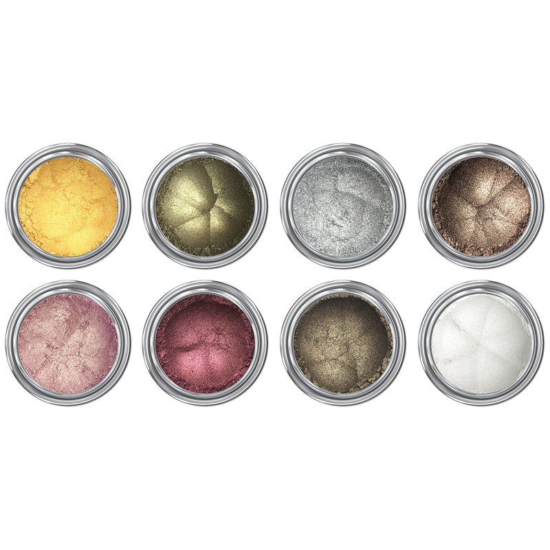 - The Complete Look — try out 8 of our Metallic Eyeshadow shades, including Coronation (Bright Metallic Copper), Eldorado (24 Carat Metallic Gold), Damned (Deep Metallic Burgundy Red), Ravish (Warm Metallic Brown), Burnt Offering (Dark Cool Metallic Brown), Cleopatra (Rich Neutral Metallic Taupe), White Lies (Pure metallic white), Mercury (Metallic bright silver). Each color comes in a smaller sample jar containing .3 grams of loose mineral eyeshadow powder, enough for 8-10 looks with each color