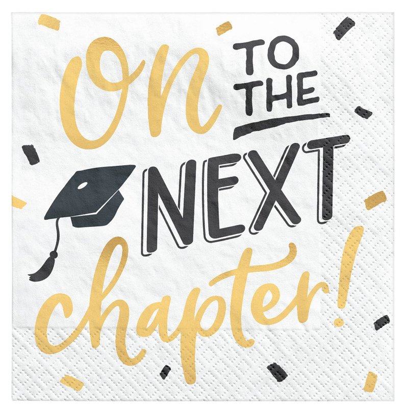 - 16X 5” X 5” luncheon napkins with the phrase “On To The Next Chapter”