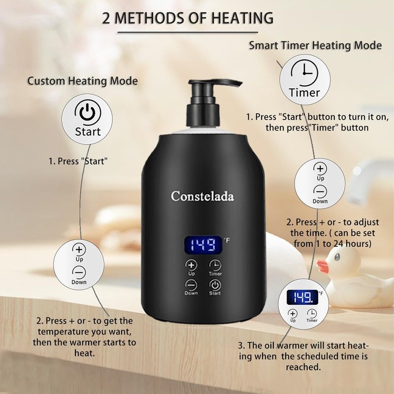 - ❤ Professional Massage Oil Warmer: The massage oil warmer can heat every kind of massage oils, body lotions, creams, gel, lube, etc easily. With heating massage oil, skin can absorb the essential oils fully, which can help you relieve fatigue, relax the mood and improve sleep.