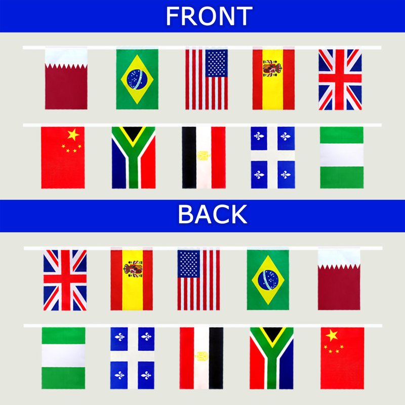 - SPECIFICATION - All countries flags are on one rope, 235 feet long with 224 different countries flags, Single flag - 14cm x 21cm/5.5" x 8.2" (W x H).