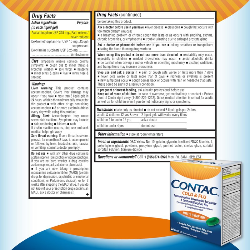 Contac Cold & Flu Medicine, Powerful, Multi-Symptom Relief for Pain, Fever, Sore Throat, Body Aches, Sneezing, Runny Nose & Cough, 24 Count Liquid Gels