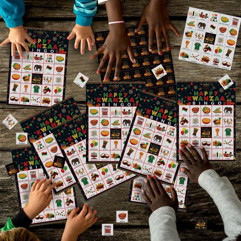 - Kwanzaa Game Set: you'll receive 28 bingo player cards, 10 marking cards (56 chips per card), and 1 calling card. It enables a large group to play simultaneously. Enjoy this thrilling Kwanzaa holiday game with your family and forge lasting memories