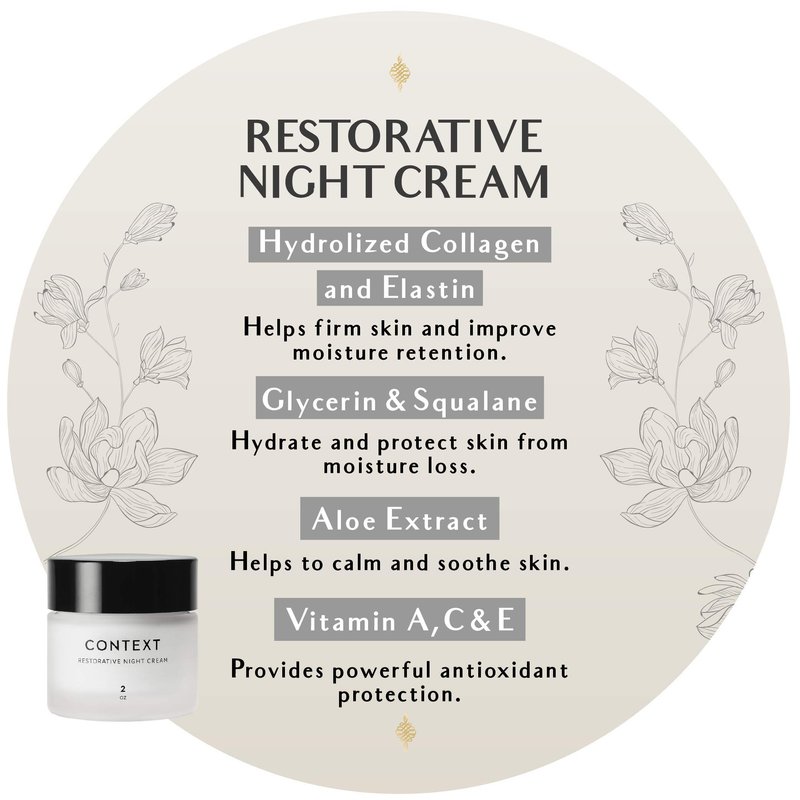 - Elevate Your Nighttime Skincare Routine: We’re raising the bar for achieving perfect skin with our Context Restorative Night Cream. This luxurious anti-aging face cream works while you sleep, delivering intense hydration and nourishment. Designed for those who see early signs of aging or want to stay ahead, it keeps your skin plump, fresh, and smooth. Packed with Vitamin C, Collagen, and Elastin, this wrinkle cream for face effectively combats wrinkles and firms your face and neck, ensuring you wake up with a revitalized and youthful complexion.