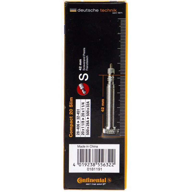 Continental 20" Bicycle Tube, Slim 1.125"/1.25" 42mm Presta Valve