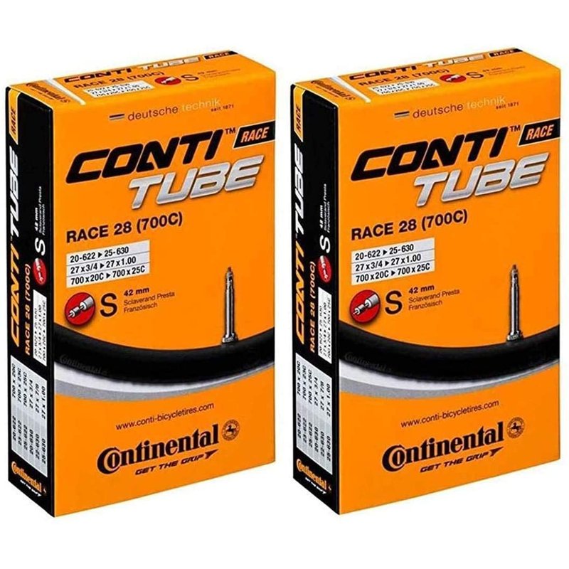 Continental Race 28" 700x20-25c Bicycle Inner Tubes -42mm Long Presta Valve (Pack of 2 Tubes )- Continental bike tubes are constructed of durable butyl rubber and are 100 percent inspected to ensure quality. The tubes are seamless and vulcanized for uniform roundness and improved reliability. Material: Butyl tubes with renowned Continental quality - Durability: Each and every inner tube passes a stringent 100% quality control inspection - Design: Seamless construction, with a mold-cured vulcanization, to ensure uniform roundness and give a smooth ride and handling.