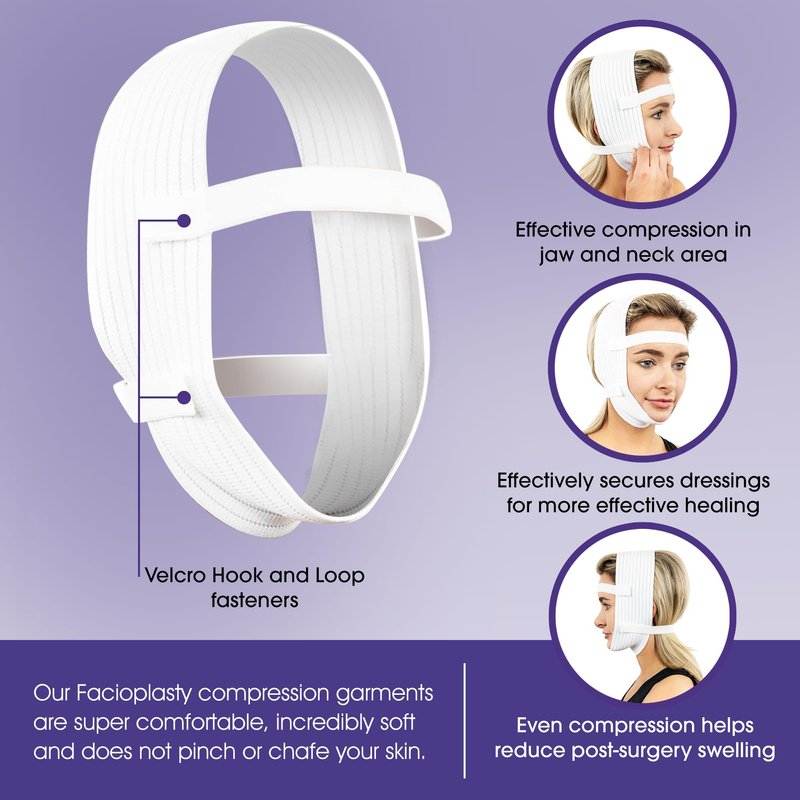 - SWELLING AND INJURY PREVENTION: Contour MD's surgeon-approved chin compression garment is your ally in the first stage of recovery. Providing facioplasty support for neck and chin, our medical wrap aids in improving blood circulation, minimizing post-surgical swelling and bruising and expelling harmful fluids for a faster and safer healing journey.