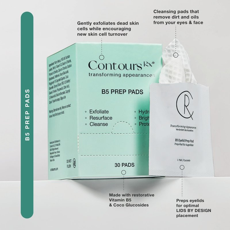 Exfoliating B5 Prep Pads by Contours Rx are dermatologist recommended single-use exfoliating pads infused with restorative vitamin B5 that cleans, removes dirt, oil, and dead skin from your eyelids and face. Ideal for everyday use, B5 eye pads and face wipes also act as a makeup remover for shadow and mascara. The cleansing pads work wonders to prepare your eye lids for the perfect placement of our Lids by Design eye lifting strips.These exfoliating pads for face prep not only cleanse but add moisture and hydration to your skin. Infused with oil-free moisturizing elements these eye lid cleaning wipes are safe to use every day for overall eye health and hygiene. Exfoliate your skin on the go or at home with our oil-free eye makeup remover pads. Each eyelid prep pack comes with 30 individually wrapped face cleansing pads for easy application and simple portability. Not only do our mini makeup wipes cleanse oils and dirt before and after the use of our Lids by Design Correcting strips but they're infused with organic B5 vitamins and coco glucosides that create a hypoallergenic, and cruelty free product you can use daily.
