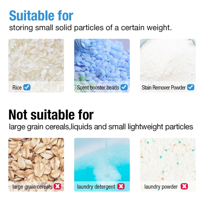 - Storage Containers: Detergent dispenser for scent booster beads, stain remover powder, black beans, carpet freshener, bath salt, rice and other solid small particles