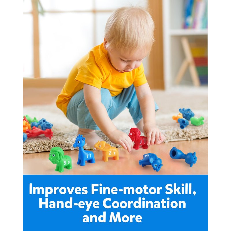 Learn Alphabet with These Cute Animals It works well for developing fine motor skills, hands on skills, hand-eye coordination, and letter recognition in the young age. 26 animals are interchangeable. Through mixing and pairing animals, kids pick color sorting skills and master the basic alphabet required for early learning. It is easy and comfortable to hold and have no sharp edges and small parts. Each toy is perfectly designed to fit small hands, easy to hold for kids.