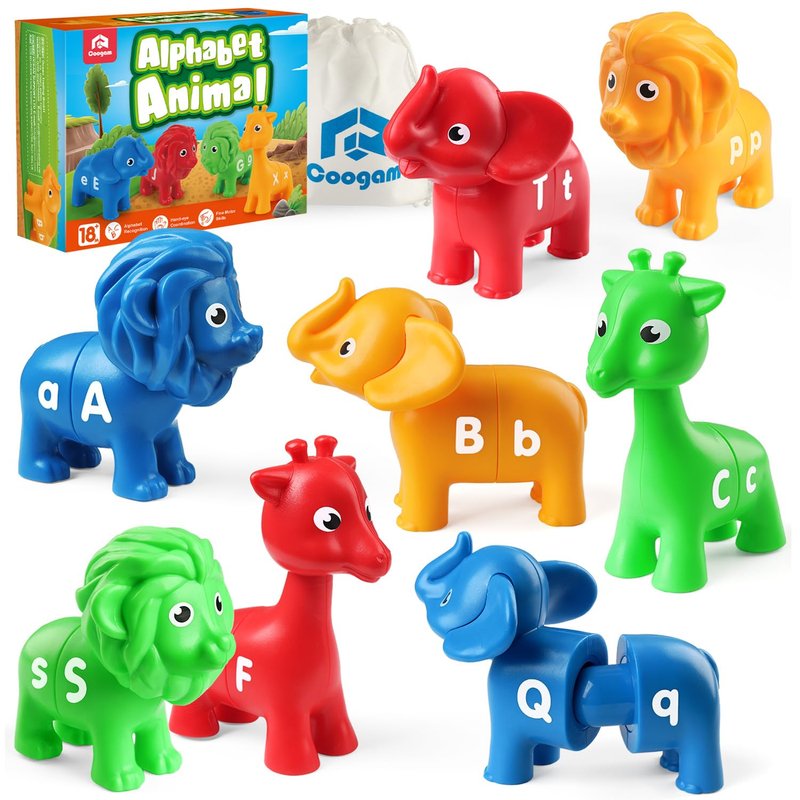 - Alphabet Learning and Matching Set: The Coogam animal alphabet matching set comes with 26 letters on 26 colorful animals (lion, elephant, giraffe). Each animal has two pairs of letters in both uppercase and lowercase. Cute alphabet animals are easy to put together, mix, match and store with a portable draw-string bag.