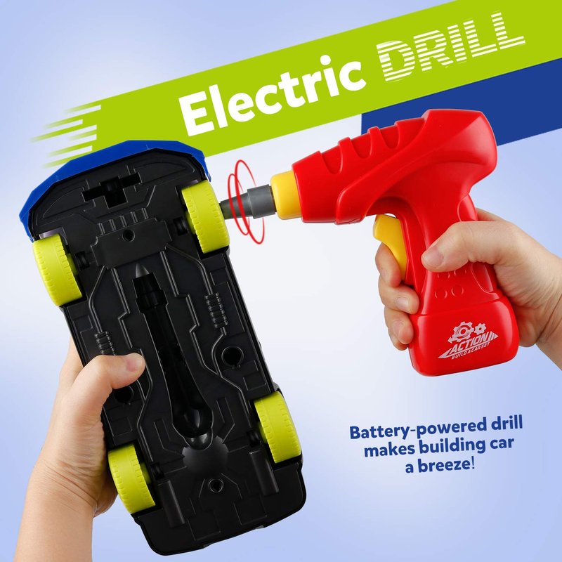 Take Apart Racing Car Take apart toy electric drill isn’t just a pretend drill; It actually works. The drill requires two AA (batteries that are not included). It also comes with a manual plastic screw driver that snaps into the bottom of the car for storage. The screws and drill/screw driver fit together fairly easily, so someone without great fine motor skills can successfully use it. The drill does not have an on/off button. You press the top of the trigger to go clockwise and the bottom of the trigger to go counter clockwise. The entire car comes apart.
