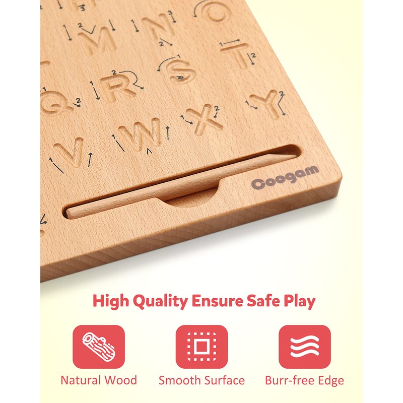 - Letter Early Learning: The letter tracing boards made of quality piece of wood and letter carvings. Natural solid wood and is coated with environmentally friendly water-based paint. It is completely safe for kids to play without the risk of harm as all edges have been made smooth with no rough surfaces.