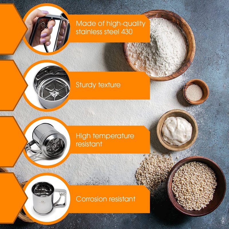 - Food Grade Stainless Steel – Our 3-cup sifter is made with rust and corrosion-resistant food-grade stainless steel to give it more durability and resilience and ensure long-lasting use in the kitchen. In our latest product improvement, you will never find any rusted part.