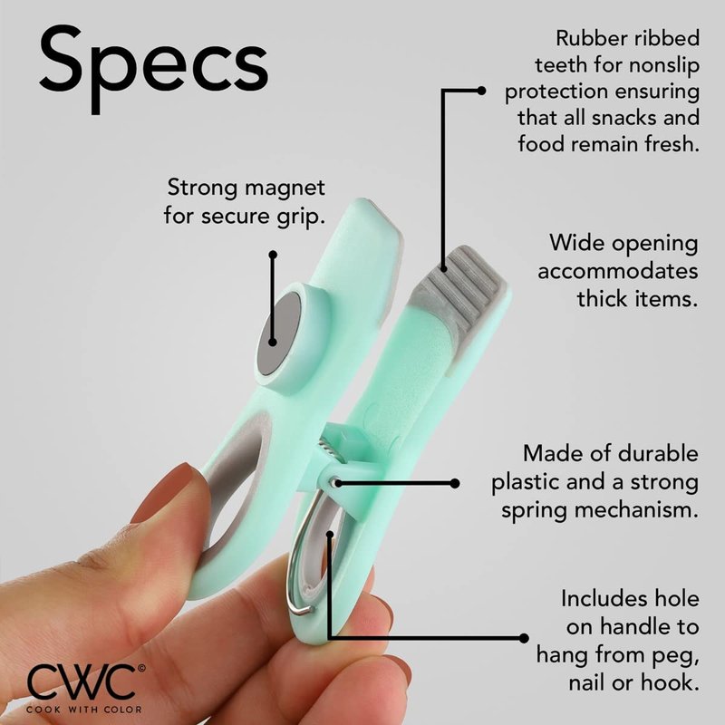 - Bag clips are one of those things you never have enough, invest in a set of durable, long lasting, soft touch, kid friendly Cook with Color food bag clips and organize your home and office with a colorful set of spring clips.