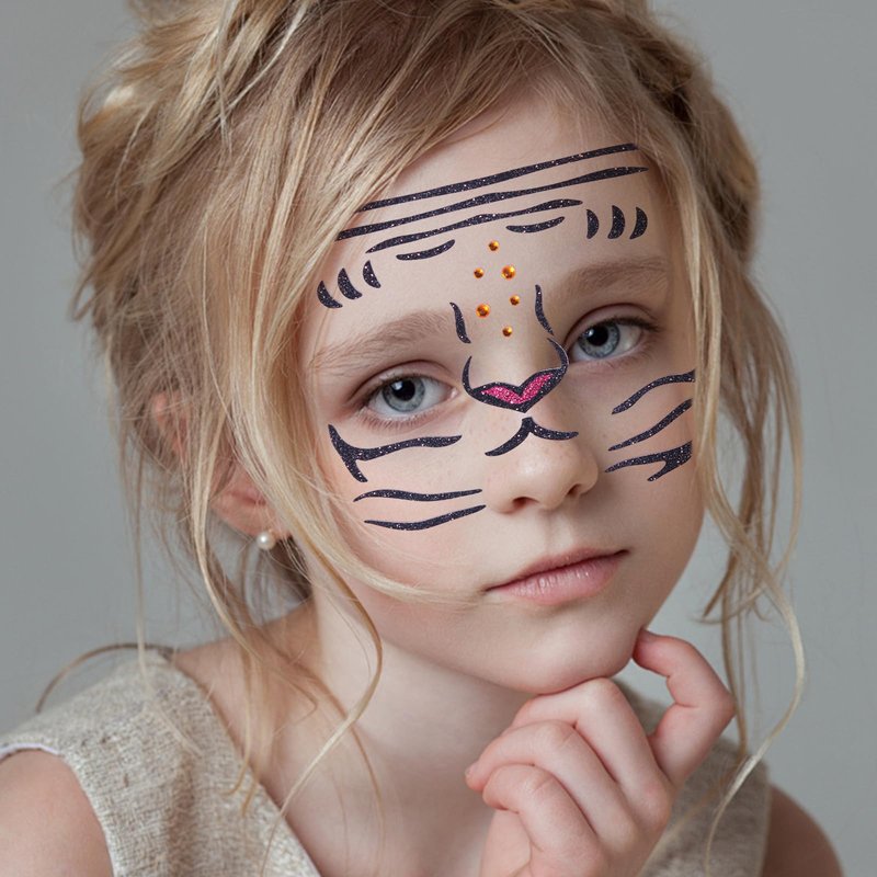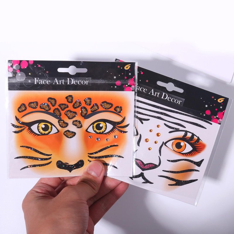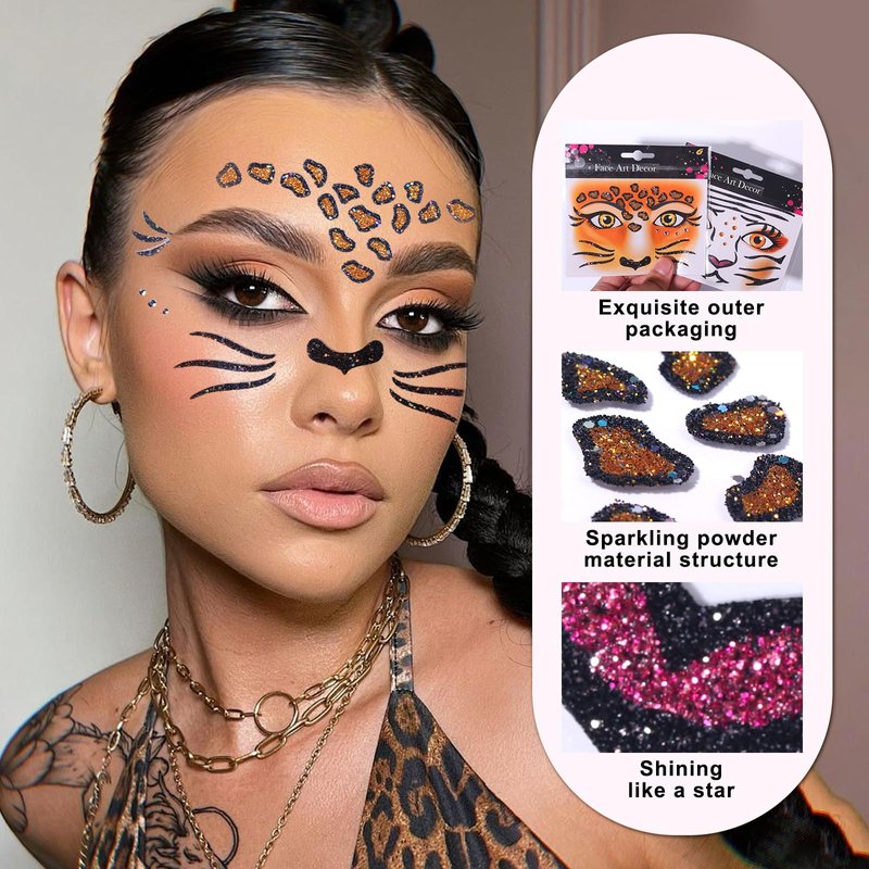 - 𝐀𝐧𝐢𝐦𝐚𝐥 𝐃𝐞𝐬𝐢𝐠𝐧:The design of lion and leopard patterns, combined with glitter and diamonds, make these facial stickers look both cool and handsome. When used as facial and eye decorations, they will become the focus of gatherings.