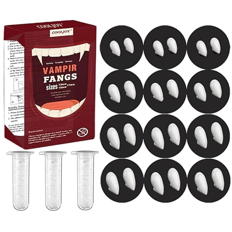 - 📦 Comprehensive Package: Includes three sizes of vampire teeth—13mm, 15mm, and 17mm, you can choose to use the size you want, —plus two tubes of teeth adhesive pellets, no separate purchase necessary.