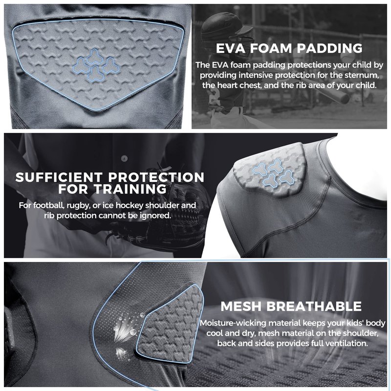 - High-density EVA foam padding protection during games. The 5-Pad Shirt protects your kids' sternum, heart chest, Waist, ribs and shoulder, Collarbone area from sudden impacts and slight injuries from balls, pitches, and hard hits. In addition, the football padded shirt can be worn under your kids' shoulder pads to relieve the pain, and irritation your kids were feeling from your pads.