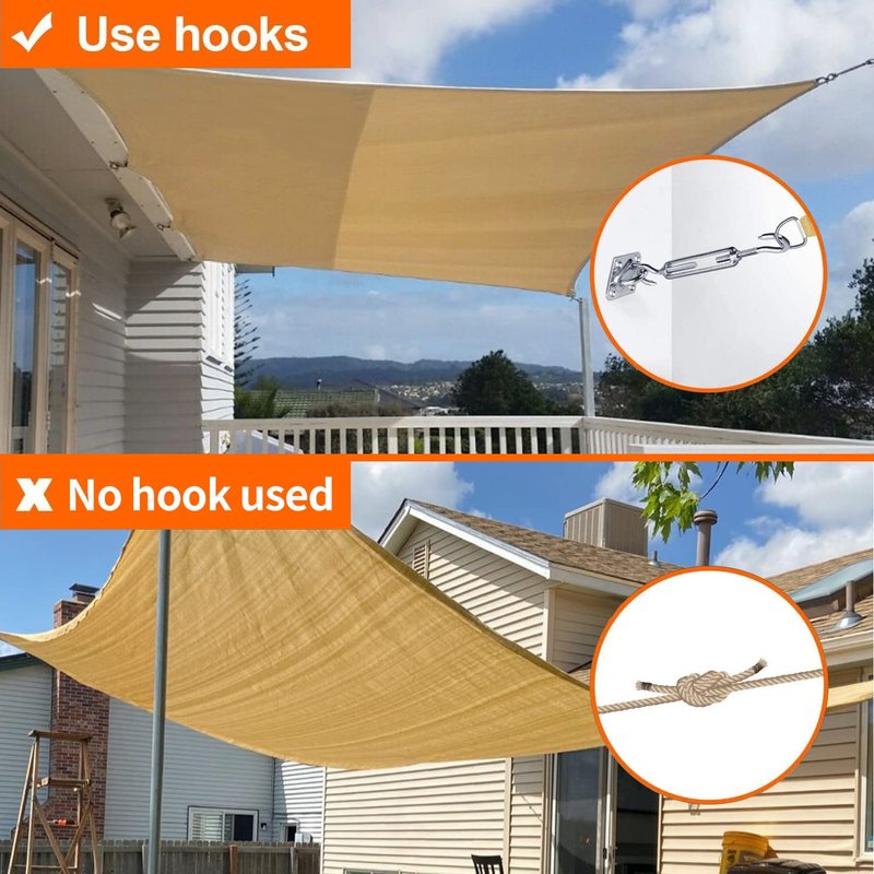 - Adjustable Turnbuckle-Come with 4 pcs 6-8.4 inches adjustable turnbuckle hook and hook with high load carrying capacity, help create tension to make your sails get tight in installation, which can make your shade sails stable, you can choose how far your sail shade is from the wall/ porch/ wood to which it is fixed.