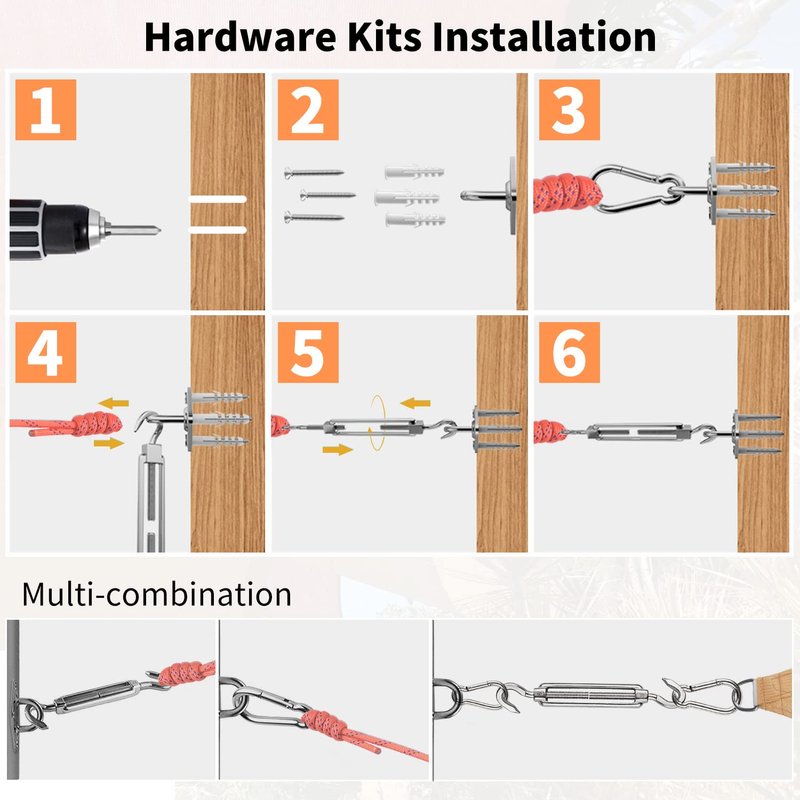 - Multi-functional Hanging Kit-The complete set is generally used in installing rectangle/triangle/square shade sails.But it's also widely used in hanging punching bag,camping hammock,swing chair,floating shelves,when used seperately.Suitable for various indoor and outdoor activities.