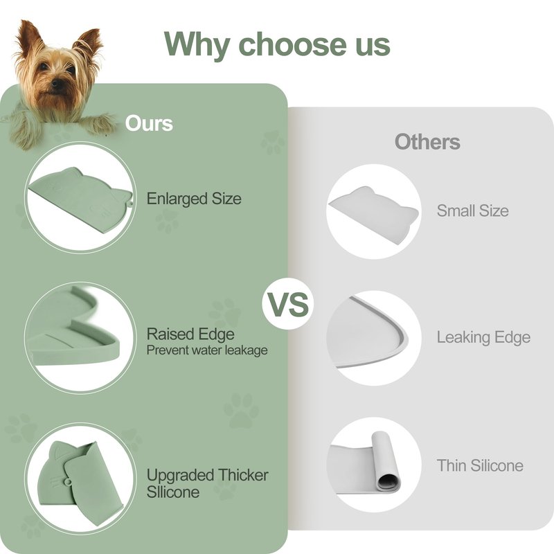 - 【Larger Size, Thicker Silicone】 --- This cat food mat size in 11in * 18in, weight is 265g. Whether you place two dog bowls or cat water fountains are perfectly adequate. At the same time, the thickened material is not easy to bite.