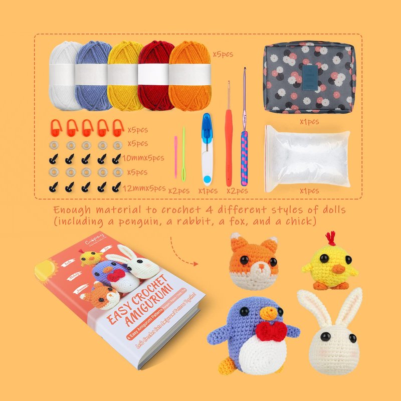 - 💖[4 Cute DIY Amigurumi Crochet Kit Dolls] Coopay crochet starter kit for beginners contains four cute crochet dolls: penguin, chicken, rabbit and fox, so you can have more diversified attempts and choices with it. You can enjoy the fun of crochet and harvest lovely handicrafts from your own knitting, and can use these adorable crocheted products to decorate your home, car, desk or as keychain decoration, bag decoration, etc.