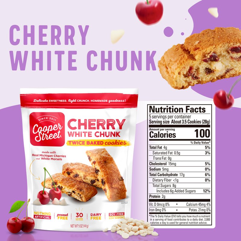 - CHERRY WHITE CHUNK - Chock full of locally sourced Michigan cherry chunks and indulgently creamy white chips, our cherry biscotti tastes like your two favorite sundae toppings on a hot summers day. Cherries and white chocolate really are a sweet combination!