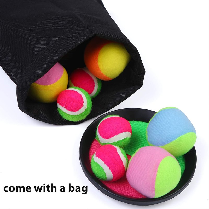 - Quantity: you will receive 4 sets of toss and catch ball game tools, 2 paddles, 1 sticky ball, 1 soft ball for each set, in total of 8 paddles, 4 sticky balls, 4 soft balls, enough for you to play and share with your friends, family; we also provide you with 1 black drawstring bag to hold them inside for easy storage and carrying