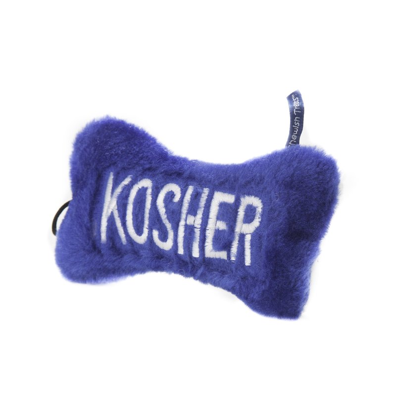 Chewish Treats by Copa Judaica Blue Plush Kosher Bone Medium with a rubber squeaker inside. All new materials. Polyester and fill. For Medium and small sized dogs Packed in a clear plastic bag. 5.50 inch long and 3.00 inch high.
