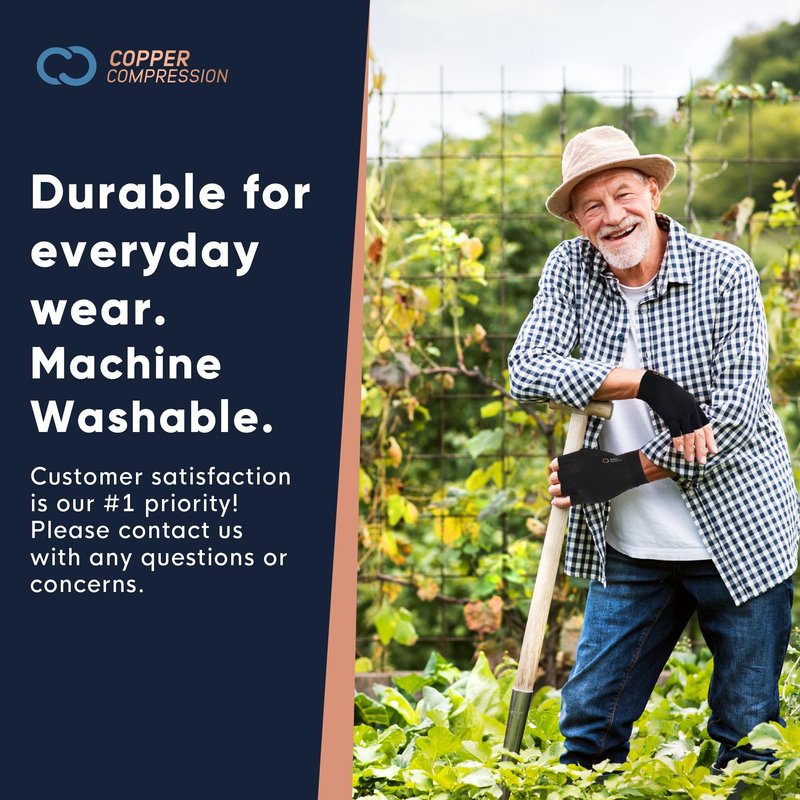 The copper-infused material used in these gloves unites comfort with functionality. The 4-Way stretch construction, open finger design and non-slip palm grips allow you your full range of motion and grip, so there's no impact on your dexterity and fine motor skills. The moisture wicking fabric keeps palms dry, cool and comfortable. Get back to drawing, typing your novel, crocheting or knitting, and more without losing an inch of compressive support.