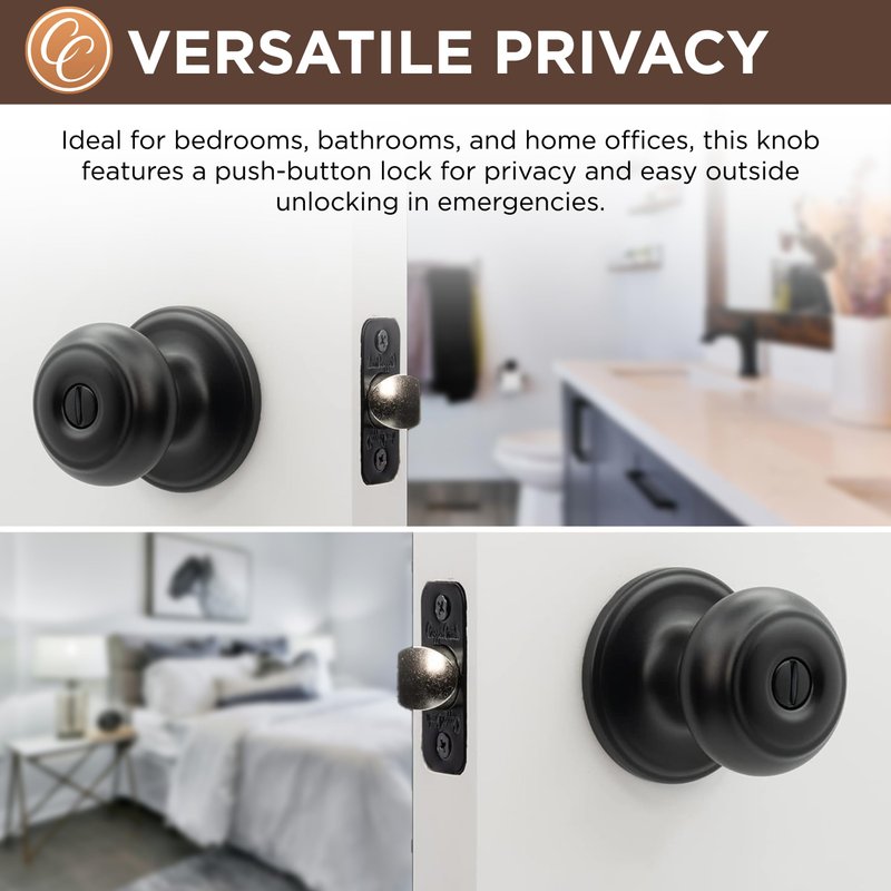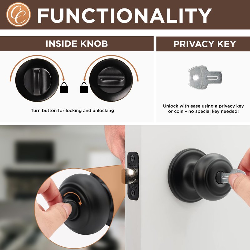 - PRIVACY DOOR KNOBS - Ideal for bedroom and bathroom use, these locking door knobs feature an exterior privacy release button and operate with coin or standard screwdriver and no privacy key required