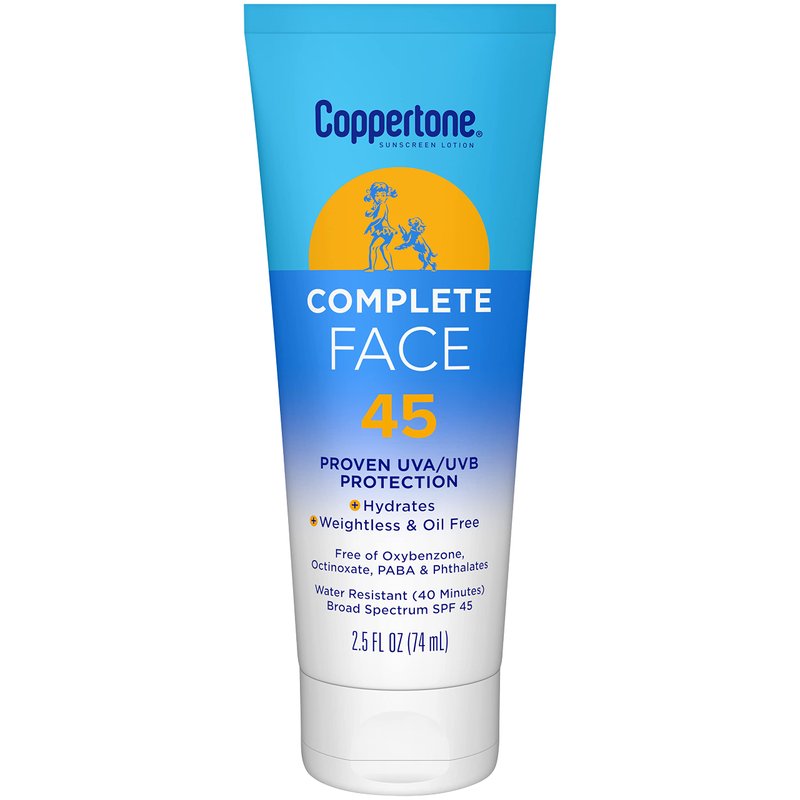 - Includes one (1) 2.5 fluid ounce tube of Coppertone Complete Face Sunscreen Lotion