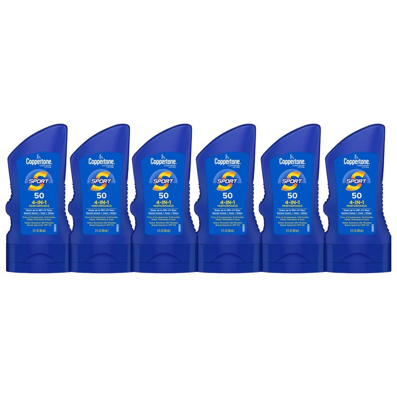 - Six (6) 3 fluid ounce bottles of Coppertone Sport Sunscreen Lotion SPF 50