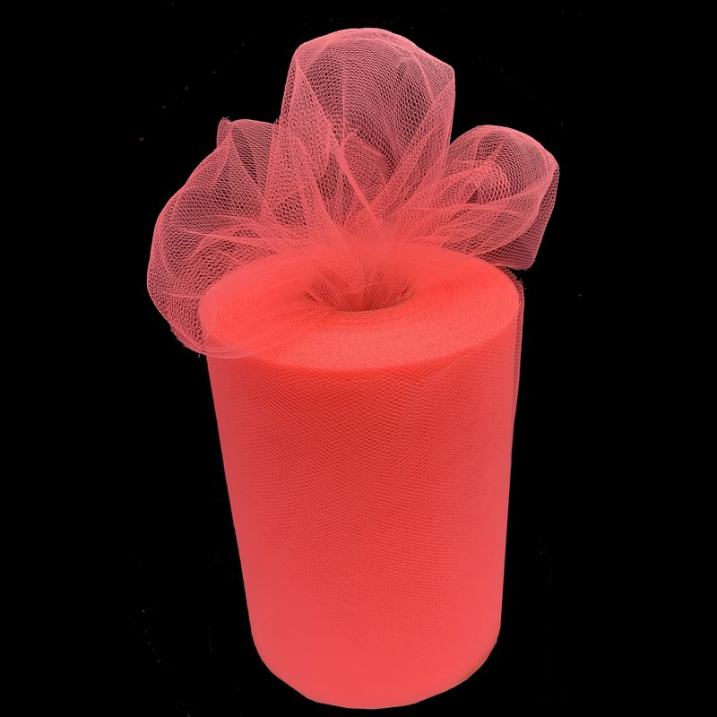 Roll of 6" x 100 yard long Coral polyester tulle. Perfect for arts and crafts, weddings and decorations. Use year round for hand made home decor and clothing. Pair this with other decorations, such as bows, backdrops, chair covers, centerpieces, lighting, swags, wreaths, garlands, craft supplies and other fabrics. Enhance the look of your DIY decorations all year long with this vibrant and versatile Tulle Netting Roll