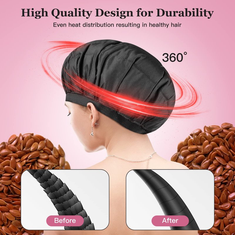 FUNCTIONALITY: Inside each thermal hair cap contains flaxseed, a flower seed that has the ability to hold and retain heat much more effectively than other options over time reheat after reheat.
