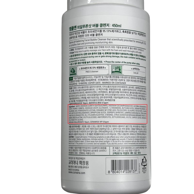 CORÉANA AMPLE:N Hyaluron Shot Bubble Cleanser – Moisturizing Foaming Facial Cleanser with Hyaluronic Acid - Bubble Face Cleanser to Control Sebum - Oil Excretion and Refine Texture, 15.2 fl.oz.