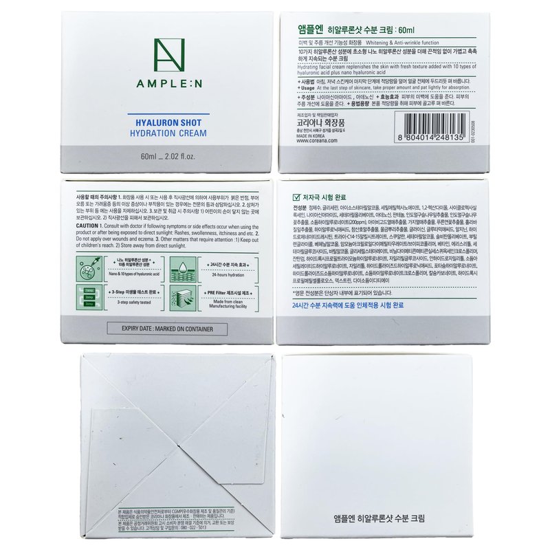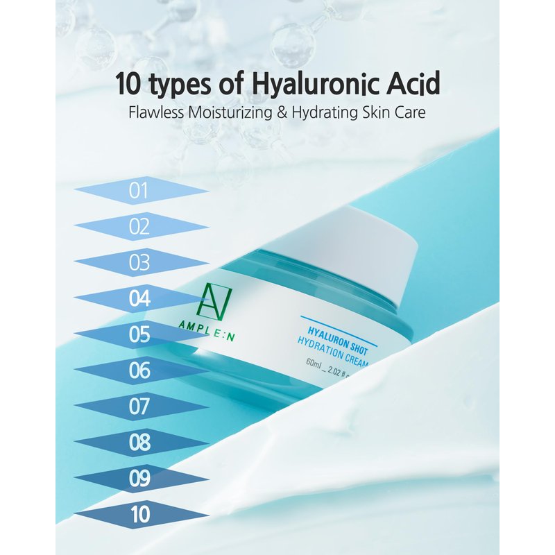 Revitalize Your Skin with Profound Hydration Discover the secret to deeply moisturized and rejuvenated skin with AMPLE:N Hyaluron Shot Hydration Cream. Fortified with an advanced formulation that harness includes the innovative power of ultra-small nano hyaluronic acid, this luxurious cream penetrates the skin's surface for rapid hydration that endures. Its sophisticated composition, teeming with a diverse array of 10 types of hyaluronic acid, promises a multi-layered moisture surge, offering a 24-hour lasting effect that maintains your skin's vitality around the clock.