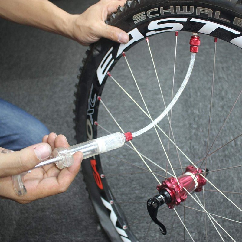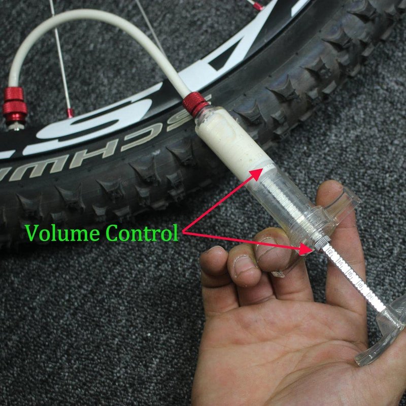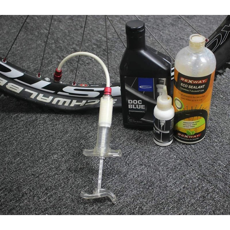 - 𝐏𝐑𝐄𝐏𝐀𝐑𝐀𝐓𝐈𝐎𝐍 - Take your Presta or Schrader valve core out first and remove any old sealant if needed. With your injector tool empty place the extended hose nozzle in your bottle of tire sealant. Withdraw the recommended quantity of sealant for your tireless set-up. Place the long nozzle inside the tire valve and insert fresh sealant into your tire.