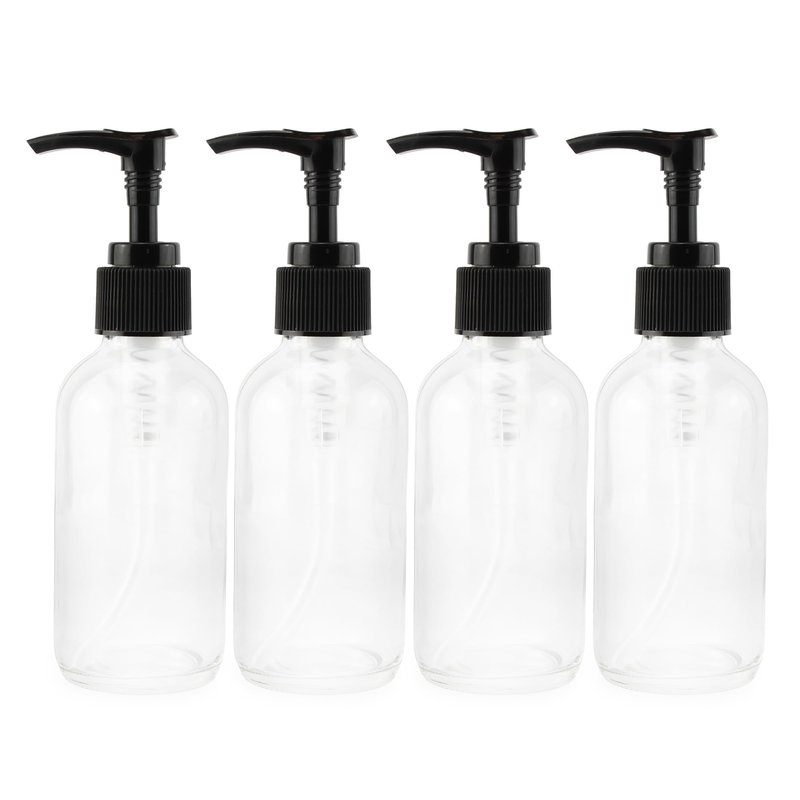 Cornucopia 4oz Clear Glass Pump Bottles (4 Pack); Refillable Glass Containers w/Black Plastic Soap/Lotion Pump Dispensers