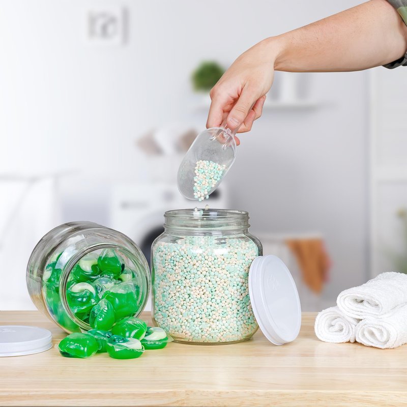 - 64-OUNCE GLASS JAR WITH LID - Receive one durable, thick walled 2 quart jar with white metal lid.