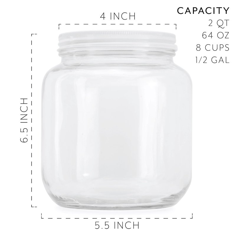 6.5 inches tall, 5.5 inches diameter, 4-inch wide mouth, food grade, lead-free clear glass with white metal lid. Capacity 8 cups = 2 quarts = half gallon.