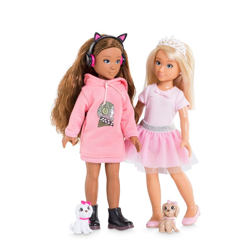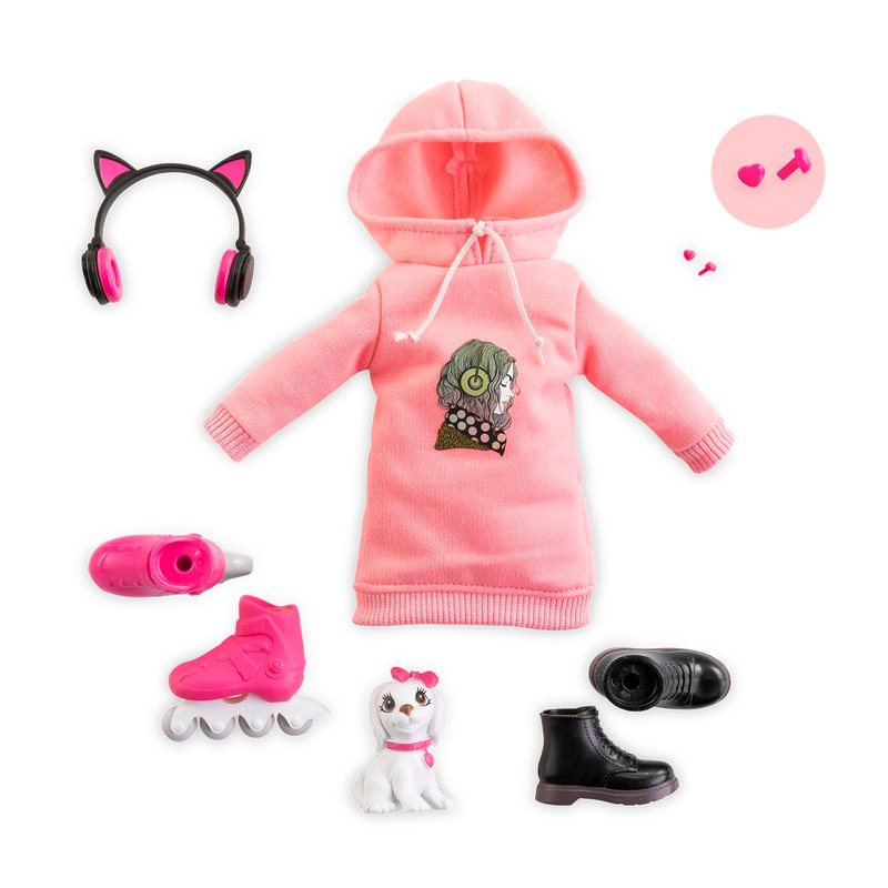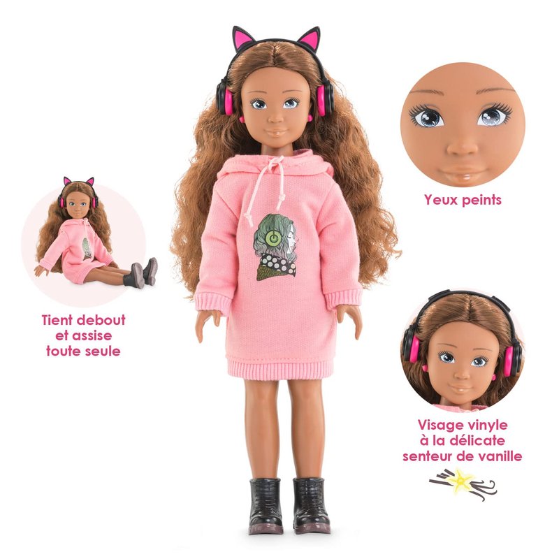- Dressing doll: the 28 cm large Corolle doll called Melody has long, brown and curly hair and wears a cool pink hoodie dress that can be completely removed. Cat ears headphones complete your outfit.