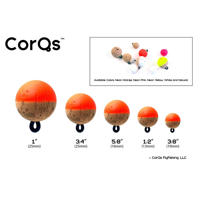 CorQs Strike Indicators, Neon, 1/2" FlyFishing Bobbers - Made in USA - EcoFriendly, Natural Cork Floats with Rubber O-Ring