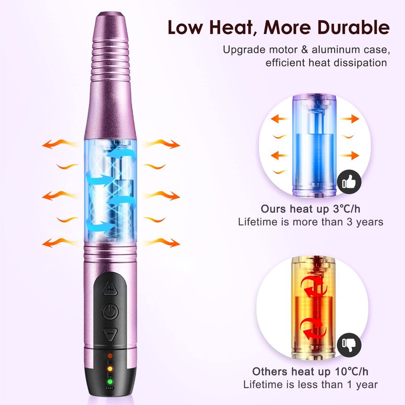 - Quiet, Low Heat and 3 Years More Durable: This nail drill is built to last, with an upgraded motor and overload protection mechanism that extends its service life. Plus, its spring structure makes it quiet and low-vibration for a more pleasant experience.